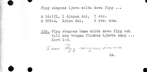 //// Flyg sångens ljuva milda duva flyg . .. //// .. //// A 16:131, I djupan dal, 7 str. //// A 305:4, Djupa dal, 6 str. kom. //// Jfr. Flyg sångens ömma milda duva flyg och //// till min trogna flickas hjärta smyg ... //// Kort 1-2. //// RA. ////