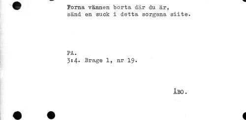 //// Forna vännen borta där du är, //// sänd en suck i detta sorgsna siite. //// PA. //// 3:4* Brage 1, nr 19. //// ÅBO. ////