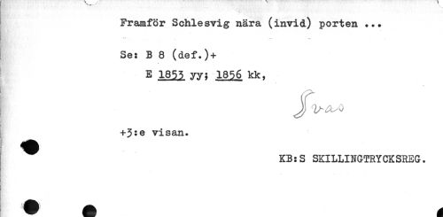 //// Framför Schlesvig nära (invid) porten ... //// Se: B 8 (def.)+ //// ' E 1855 yy; 1856 kk, //// J, ^ - //// nf, //// I +3:^ visan. //// ^ KB:S SKILLINGTRYCKSREG. ////