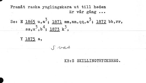 //// Framåt raska ynglingskara ut till heden //// är vår gång ... //// Se: E 1865 1871 mm,nn,qqya^; 1872 bb,rr, //// Q <3 n 3 1 4. ^ oyx Tf 3 //// ---SS, Uy y-LOi 3 ^ f----- //// / * . //// Y 1875 a, //// J //// KB:S SKILLINGTRYCKSREG. ////