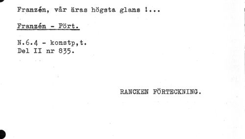 //// Franzén, vår äras högsta glans i... ] //// Franzén - Pört. //// N.6.4 - konstp,t. //// Del II nr 835. //// <. ? //// 1 //// RANCKEN FÖRTECKNING. ////