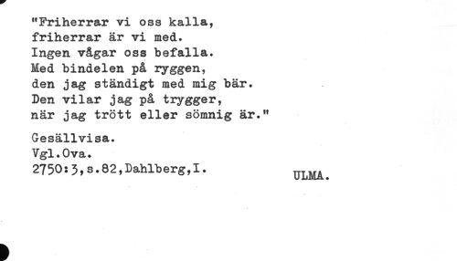 //// "Friherrar vi oss kalla, //// friherrar är vi med. //// Ingen vågar oss befalla. //// Med bindelen på ryggen, //// den jag ständigt med mig bär. //// Den vilar jag på trygger, //// när jag trött eller sömnig är." //// Gesällvisa. //// Vgl.0va. //// 2750:3,s. 82, Dahlberg, I. ^^ ////