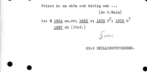 //// Frihet är en skön och härlig sak ... //// (Av O.Malm) //// ^ . //// Se: E 1864 nn,rr; 1865 o; 1870 f^; 1876 h^ //// 1887 dd (förf.) //// I //// KB:S SKILLINGTRYCKSREG. //// ; - * r ////
