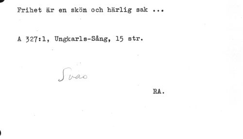 //// Frihet är en skön och härlig sak ... //// A 327:1, Ungkarls-Sång, 15 str. //// J //// RA. ////