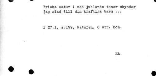 //// Friska natur ! med jublande toner skyndar //// jag glad till din kraftiga barm ... //// ! //// ....... //// B 27:1, s.199? Naturen, 8 str. kom. //// * //// RA. ////
