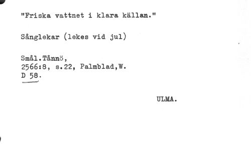 //// "Friska vattnet i klara källan." //// Sånglekar (lekes vid jul) //// * //// Smål.Tånnö, //// 2566:8, s.22, Palmblad,W. //// D _58. //// ULMA. ////