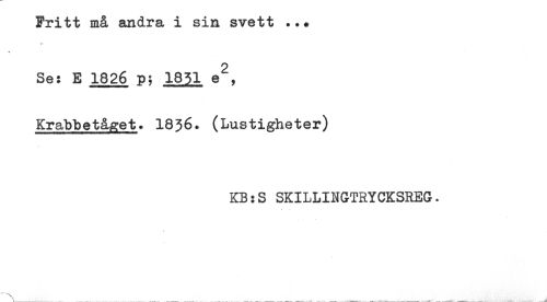 //// Fritt må andra i sin svett ... //// Se: E 1826 p; 1851 e^, //// Krabbet&aet. I836. (Lustigheter) //// KB:S SKILLINGTRYCKSREG. ////