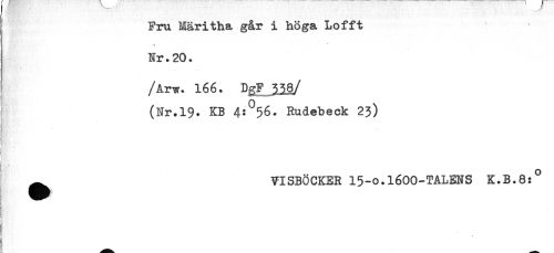 //// Fru Märitha går i höga Lofft //// Nr.20. //// /Arw. 166. DgF 32g //// /(Nr.19. KB 4:°56. Rudebeck 23) //// ! //// ^ VISBÖCKER 15-O.1600-TALENS K.B.8:' //// i //// ^^ ' //// I) ////