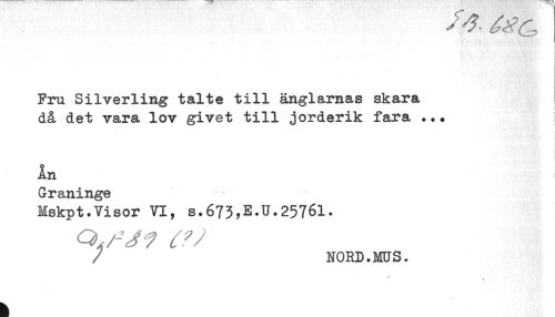 //// * //// Fm Silverling talte till änglarnas skara //// då det vara lov givet till jorderik fara ... //// Ån //// Graninge //// Mskpt.Visor VI, s.673,E.U.25761. ////