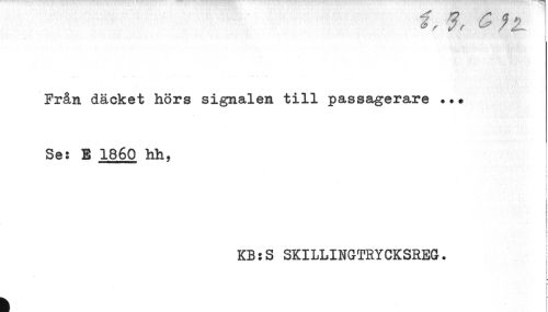 //// Från däcket hörs signalen till passagerare ... //// Se: E 1860 hh, //// t //// : //// i //// i //// < //// r //// KB:S SKILLINGTRYCKSREG. //// ! //// i. ////