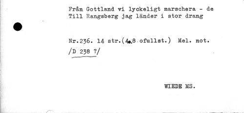 //// Från Gottland vi lyckeligt marschera - de //// Till Rangsberg jag länder i stor dräng //// Nr.236. 14 str.(4t,S.ofullst.) Mel. not. //// /D 238 ? //// /q //// ) //// . //// j //// WIEDE MS. //// ! - < ' ////