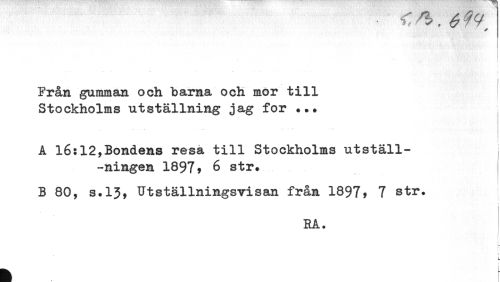//// Från gumman och barna och mor till //// Stockholms utställning jag for ... //// A 16:12,Bondens resa till Stockholms utställ- //// ningen 1897, 6 str. //// B 80, s.13, Utställningsvisan från 1897? 7 str. //// RA. //// ! //// t //// L //// ! //// 4 //// L //// i ////