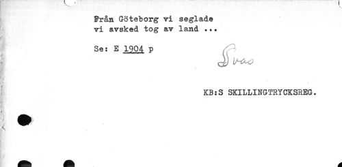 //// ?rån Göteborg vi seglade //// vi avsked tog av land ... //// HB ' //// Se: E 1904 p //// KB:S SKILLINGTRYCKSREG. //// ^^^^ ''' ////
