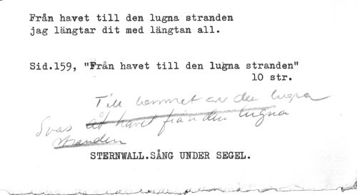 //// Från havet till den lugna stranden //// jag längtar dit med längtan all. //// Sid.159, "Från havet till den lugna stranden" //// 10 str. //// STERNWALL.SÅNG UNDER SEGEL. ////