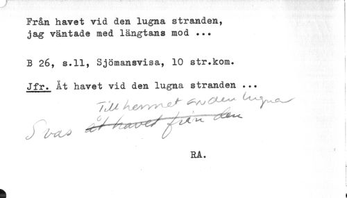 //// Från havet vid den lugna stranden, //// jag väntade med längtans mod ... //// B 26, s.ll, Sjömansvisa, 10 str.kom. //// Jfr. Åt havet vid den lugna stranden ... //// ] //// RA. ////