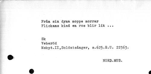 //// Från sin dyna moppe morrar //// Flickans kind en ros blir lik ... //// Sk //// Veberöd //// Mskpt.II? Soldat sånger, S.625.E.U. 22363. //// ^ NORD.MUS. ////