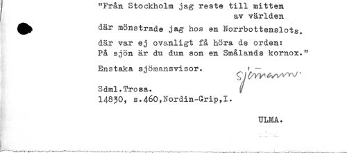 //// ! "Från btockhoim jag reste till mitten //// j av världen //// ^^ där mönstrade jag hos en Norrbottenslots. //// där var ej ovanligt få höra de orden: //// På sjön är du dum som en Smålands komox." //// Enstaka sjömansvisor. ? - //// Sdml.Trosa. ^ //// I483O, s.46O,Nordin-Grip,I. ////
