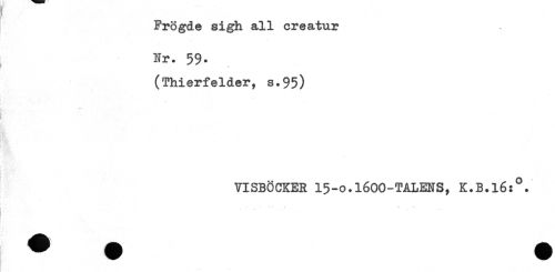 //// Frogde sigh all creatur //// Nr. 59. //// (Thierfelder, s-95) //// 1 //// - //// . //// VISBÖCKER I5-0.I6OO-TALENS, K.B.16:°. ////