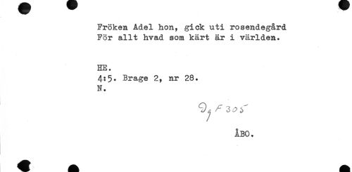 //// Fröken Adel hon, gick uti rosendegård //// För allt hvad som kärt är i världen. //// HE. //// 4:$. Brage 2, nr 28. //// N. //// ÅBO. ////