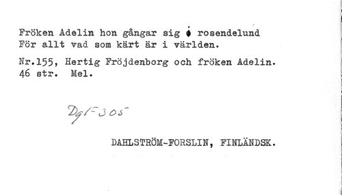 //// Fröken Adelin hon gångar sig $ rosendelund //// För allt vad som kärt är i världen. //// Nr.155, Hertig Fröjdenborg och fröken Adelin. //// 46 str. Mel. //// - //// ! //// t //// DAHLSTRÖM-FORSLIN, FINLÄNDSK. //// j //// ) //// 1 ////