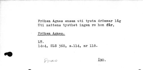 //// Fröken Agnes ensam uti tysta drömmar låg //// Uti nattens tysthet ingen ro hon får. //// Fröken Agnes. //// LT. //// 14:4, SLS 36O, s.114, nr 118. //// ÅBO. ////