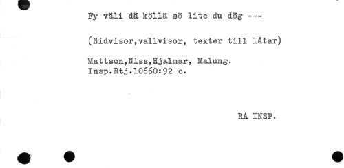 //// Fy väli dä kollä sö lite du dög -- //// (Nidvisor,vallvisor, texter till låtar) //// Mat t s on,Ni s s,Hj almar, Malung. //// Insp.Rtj.10660:92 c. //// RA INSP* ////