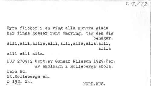 //// Fyra flickor i en ring alla muntra glada //// här finns gossar runt omkring, tag den dig //// b ehagar. //// Alli,alli,allia,alli,alli,alla,alla,alli, //// allia i //// } //// alli alli alla. i //// } //// LUF 2709:2 Uppt.av Gunnar Nilsson 1929*Ber. //// av skolbarn i Mölleberga skola. //// Bara hd. //// St.Mölleberga sn. //// DJL92* ?jnp-n nu3 ////