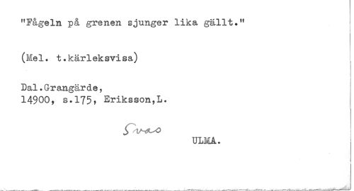 //// "Fågeln på grenen sjunger lika gällt." //// (Hel. t.kärleksvisa) //// ! //// Dal.Grangärde, //// 14900, s.175, Eriksson,L. //// ULMA. ////