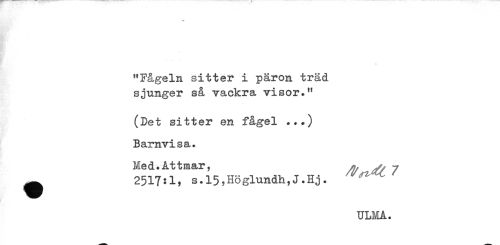 //// "Fågeln sitter i päron träd //// sjunger så vackra visor." //// (Det sitter en fågel .,.) //// Barnvisa. //// Med.Attmar, y //// ^ 2517:1, s.l5,Höglundh,J.Hj. ^^ //// ULMA. ////