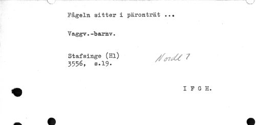 //// Fågeln sitter i päronträt ..* //// Vaggv.-barnv. //// Stafsinge (Hl) ^^ ^ //// 3556, s.19. //// ^ I F G H. ////