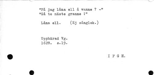 //// "Få jag låna ell å vanne ? -" //// "Gå te näste granne t" //// Låna ell. (Ej sånglek.) //// Upphärad Vg. //// 1628. s.19. ////