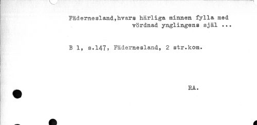 //// Fädernesland,hvars härliga minnen fylla med //// vördnad ynglingens själ ... //// B 1, s.147? Fädernesland, 2 str.kom. //// y*. //// ! //// ff'< //// t .. - //// ^ RA. ////
