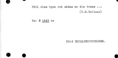 //// w //// Fäll dina ögon och skäms nu din tossa ... //// (C.M.Bellman) //// Se: E 1849 oo //// KB:S SKILLINGTRYCKSREG. ////