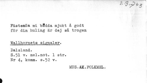 //// Fästemöa mi bädda mjukt å godt //// för din huling är dej så trogen //// Wallhornets signaler. //// i //// Dalsland. //// S.51 v. mel.not. 1 str. i //// Nr 4? komm. s.52 v. //// mS.AK.FOLKMEL. ////