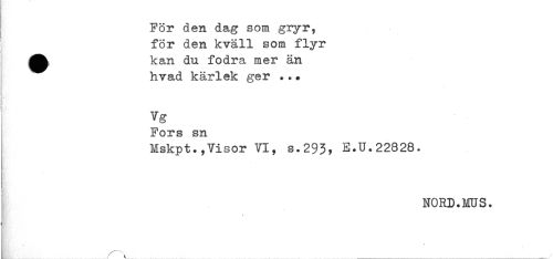 //// För den dag som gryr, //// för den kväll som flyr //// ^ kan du fodra mer än //// hvad kärlek ger ... //// Vg //// Fors sn //// Mskpt.,Visor VI, s.293, E.U.22828. //// NORD.MUS. ////
