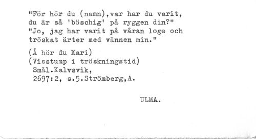//// "För hör du (namn),var har du varit, //// du är så 'böschig' på ryggen din?" //// "Jo, jag har varit på våran loge och //// tröskat ärter med vännen min." //// (Å hör du Kari) //// (Visstump i tröskningstid) //// Smål.Kalvsvik, //// 2697:2, s.5.Strömberg,A. //// ULMA. ////