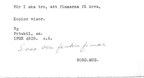 //// För I ska tro, att finnarna få ärva, //// Kopior visor. //// Vg //// Fotskäl, sn. //// IFGH 4828. s*6. //// NORD. ms. ////