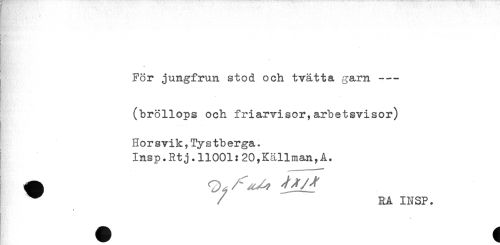 //// * //// For jungfrun stod och tvätta garn --- //// (bröllops och friarvisor,arbetsvisor) //// Hor svik ? Tys tb erga. //// Insp.Rtj.11001:20,Källman,A. //// ^ RA INSP. ////