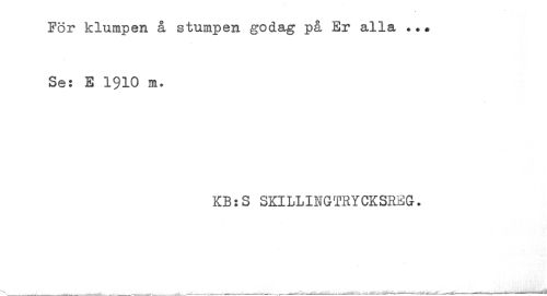 //// För klumpen å stumpen godag på Er alla ..* //// Se: E 1910 m* //// KB:S SKILLINGTRYCKSREG. ////