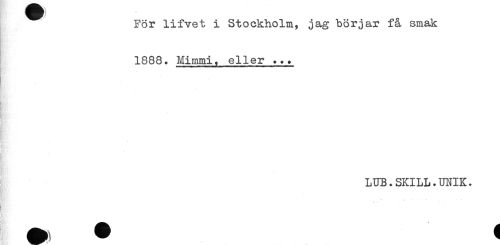 //// För lifvet i Stockholm, jag börjar få smak //// 1888. Mimmi, eller ... //// } //// 'C.'.. //// ! //// LUB.SKILL.UNIK. ////
