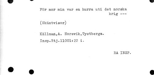 //// För mor min var en hurra uti det norska //// krig--- //// (Skämtvisor) //// Källman,A. Horsvik, Tystberga. //// Insp.Rtj.11001:22 i. //// RA INSP. ////
