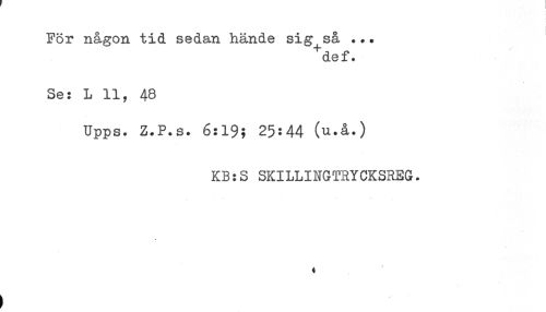//// För någon tid sedan hände sig så ... //// ^def. //// Se: L 11, 48 //// Upps. Z.P.s. 6:19; 25:44 (u.å.) //// KB:S SKILLINGTRYCKSREG. ////