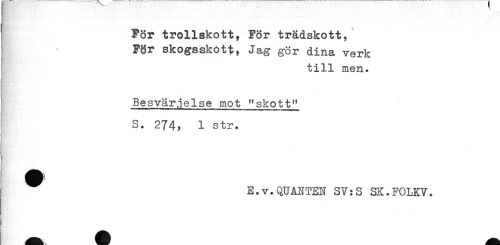 //// [ For trollskott, För trädskott, //// ! - F8r skogsskott, Jag gör dina verk //// till men. //// - //// Besvärjelse mot "skott" //// j S. 274, 1 str. //// E.v.QUANTEN SV:S SK.FOLKV. ////