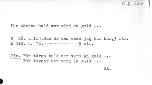 //// i //// } //// För tärnan huld mer värd än guld ... //// B 26, s.115,Han är den enda jag har kär,3 str. //// A 518, s. 76,----3 str. //// Jfr. För tärna huld mer värd än guld ... //// För tärnor mer vård än guld ... ////