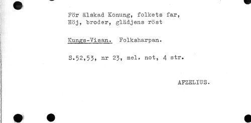 //// För älskad Konung, folkets far, //// Höj, broder, glädjens röst //// Kungs-Visan. Folk sharp an. //// I S.52,53, nr 23, mel. not, 4 str. //// AFZELIUS. ////