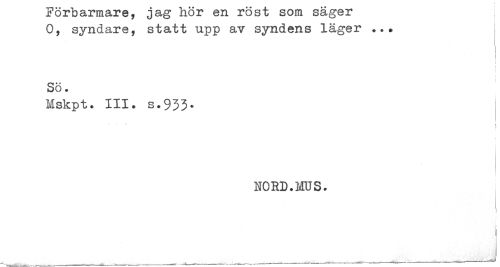 //// Förbarmare, jag hör en röst som säger //// 0, syndare, statt upp av syndens läger ... //// Sö. //// Mskpt. III. s.933. //// ! //// '* < //// NORD.MUS. ////