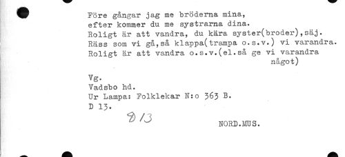 //// ^ Före gångar jag me bröderna mina, //// efter kommer du me systrarna dina. //// Roligt är att vandra, du kära syster(broder),säj. //// Rass som vi gå,så klappa(trampa o.s.v.) vi varandra //// Roligt är att vandra o.s.v.(el.så ge vi varandra //// någo t) //// Vg. //// Vadsbo hd. //// Ur Lampa: Folklekar N:o 363 B. //// D 13. //// ^ /J //// ^ ^ NORD.ms. ////