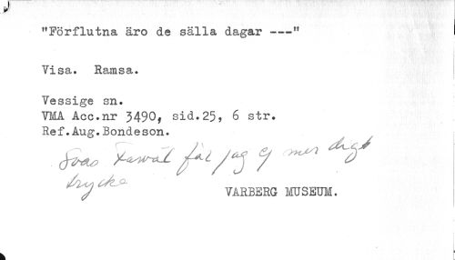 //// y //// "Förflutna åro de sälla dagar --" //// Visa. Ramsa. //// Vessige sn. //// VMA Acc.nr 3490, sid.25, 6 str. //// Ref.Aug.Bondeson. //// VARBERG KUSEUM. ////