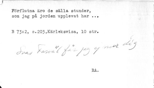 //// Förflutna äro de sälla stunder, //// som jag på jorden upplevat har ... //// B 73:2, s.203,Kärleksvisa, 10 str. //// .. //// RA. ////