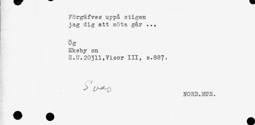//// Förgäfves uppå stigen //// jag dig att möta går ... //// + * //// Og //// Ekeby sn //// E.U.20311,Visor III, s.887. //// NORD. ms. ////